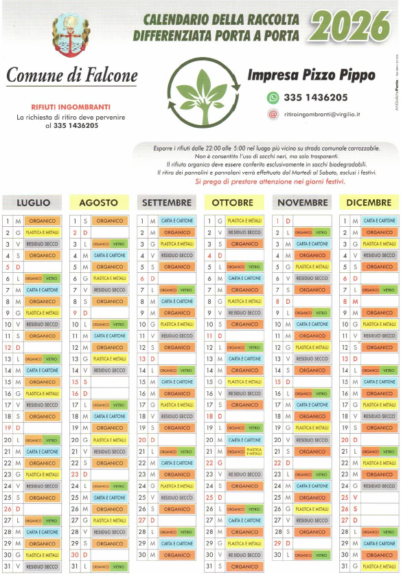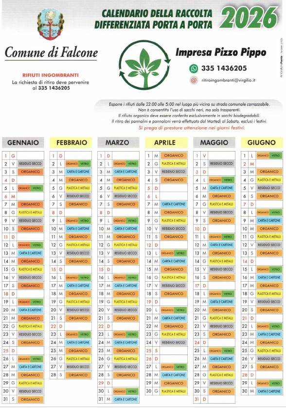 si prescrivi a tutti i residenti e aventi immobili sul territorio comunale del comune di falcone, che il conferimento dei rifiuti all'esterno dei propri immobili dovrà seguire rigorosamente le giornate indicate nel suddetto calendario.